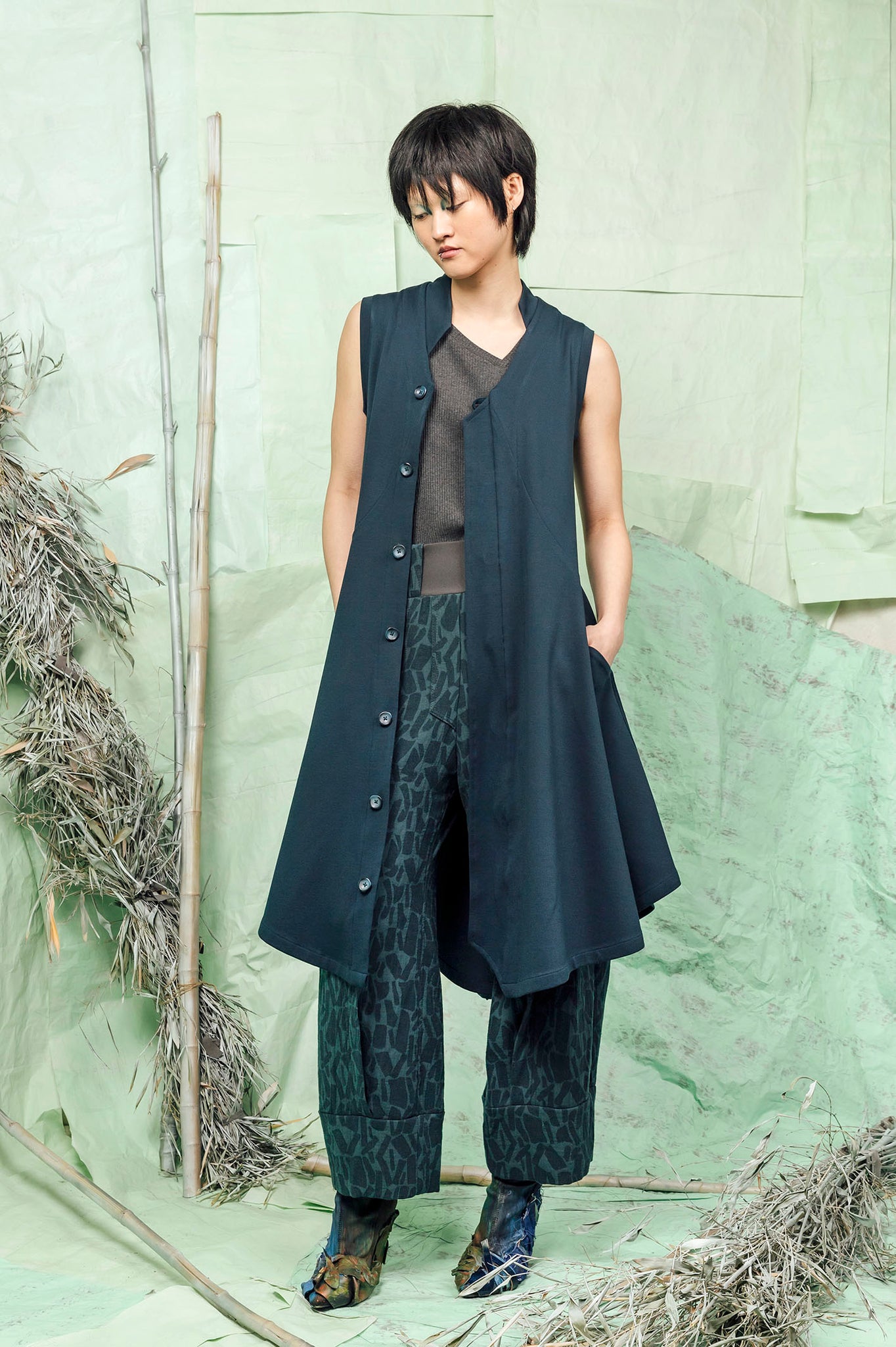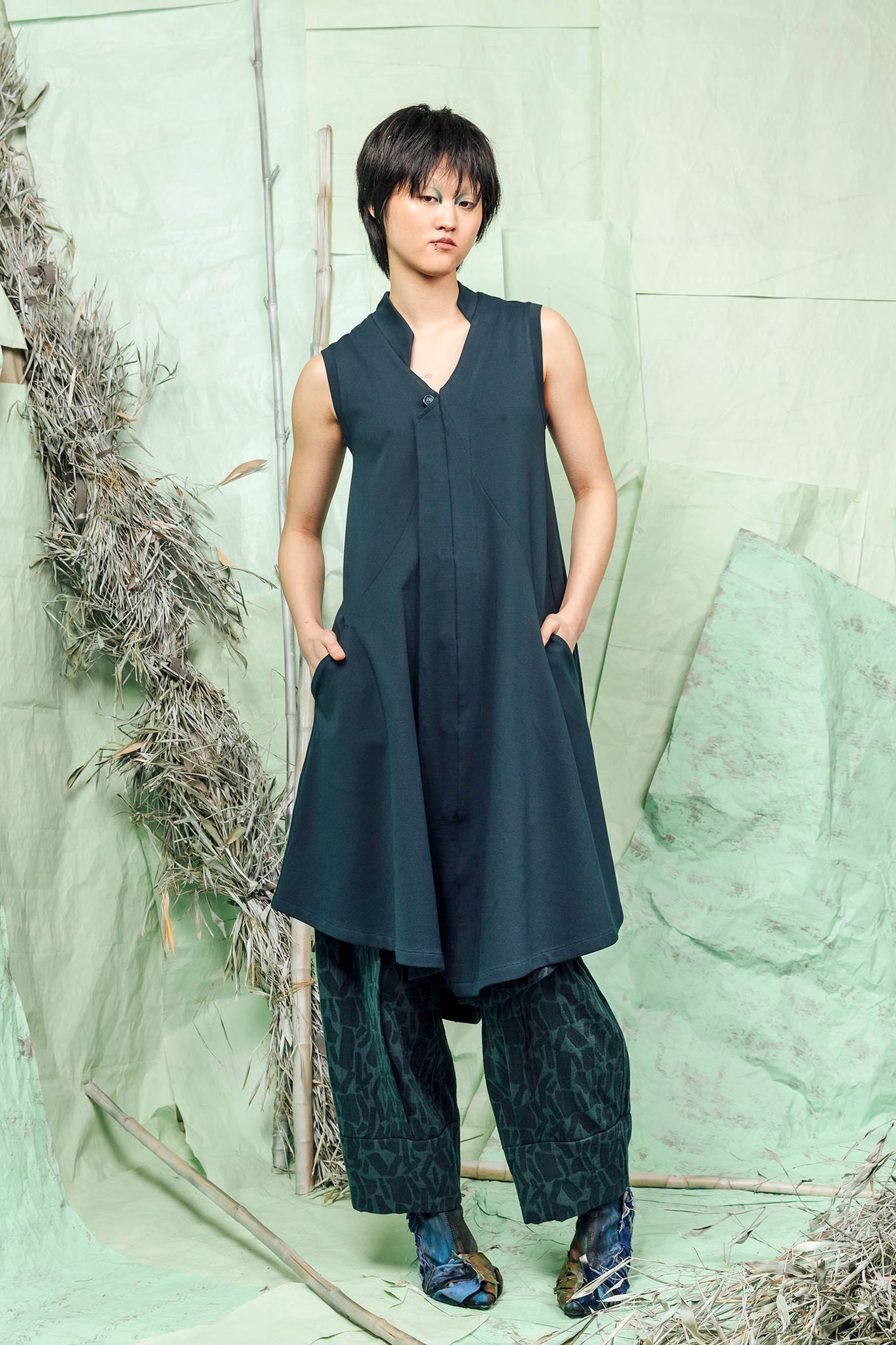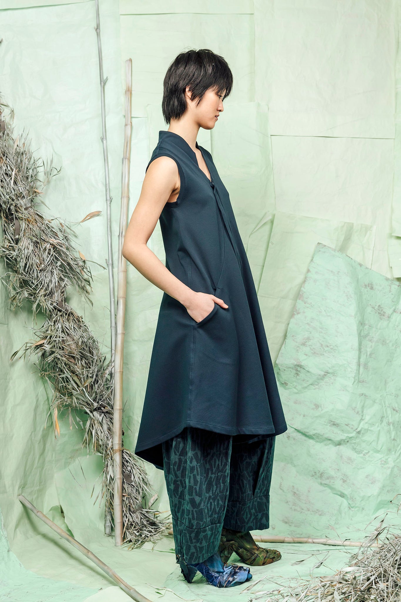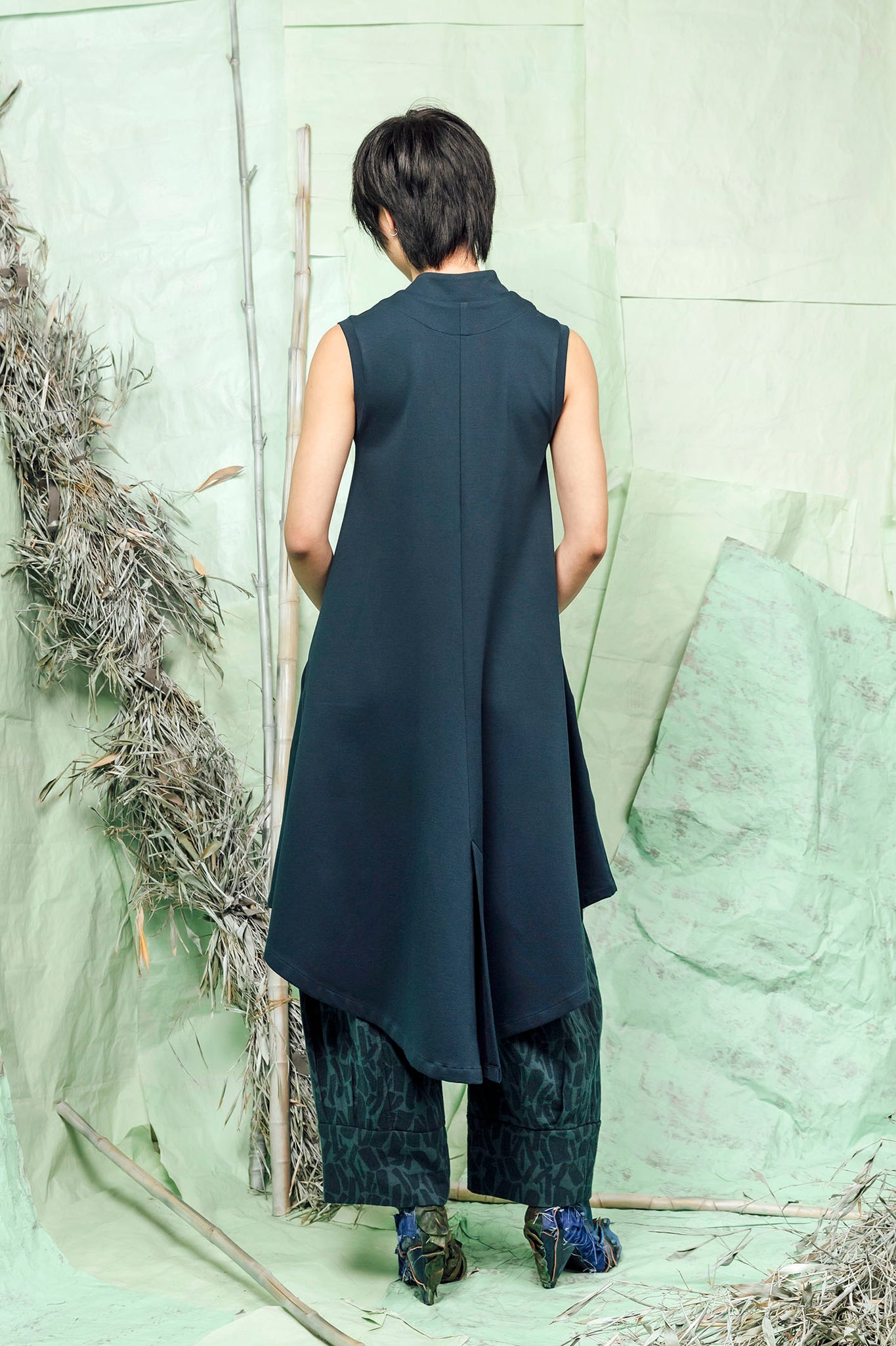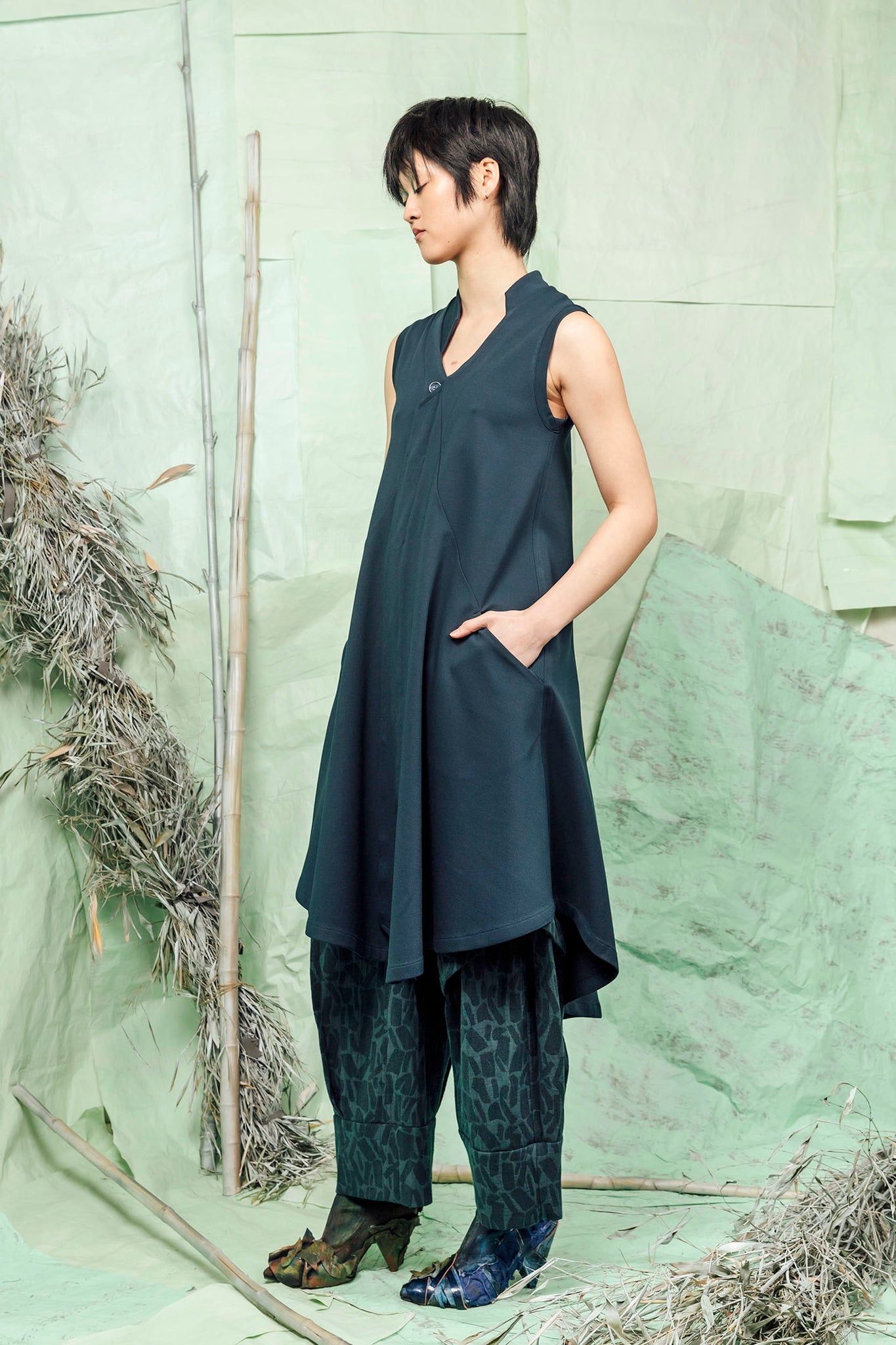 - V shaped neckline with an asymmetrically cut stand collar.