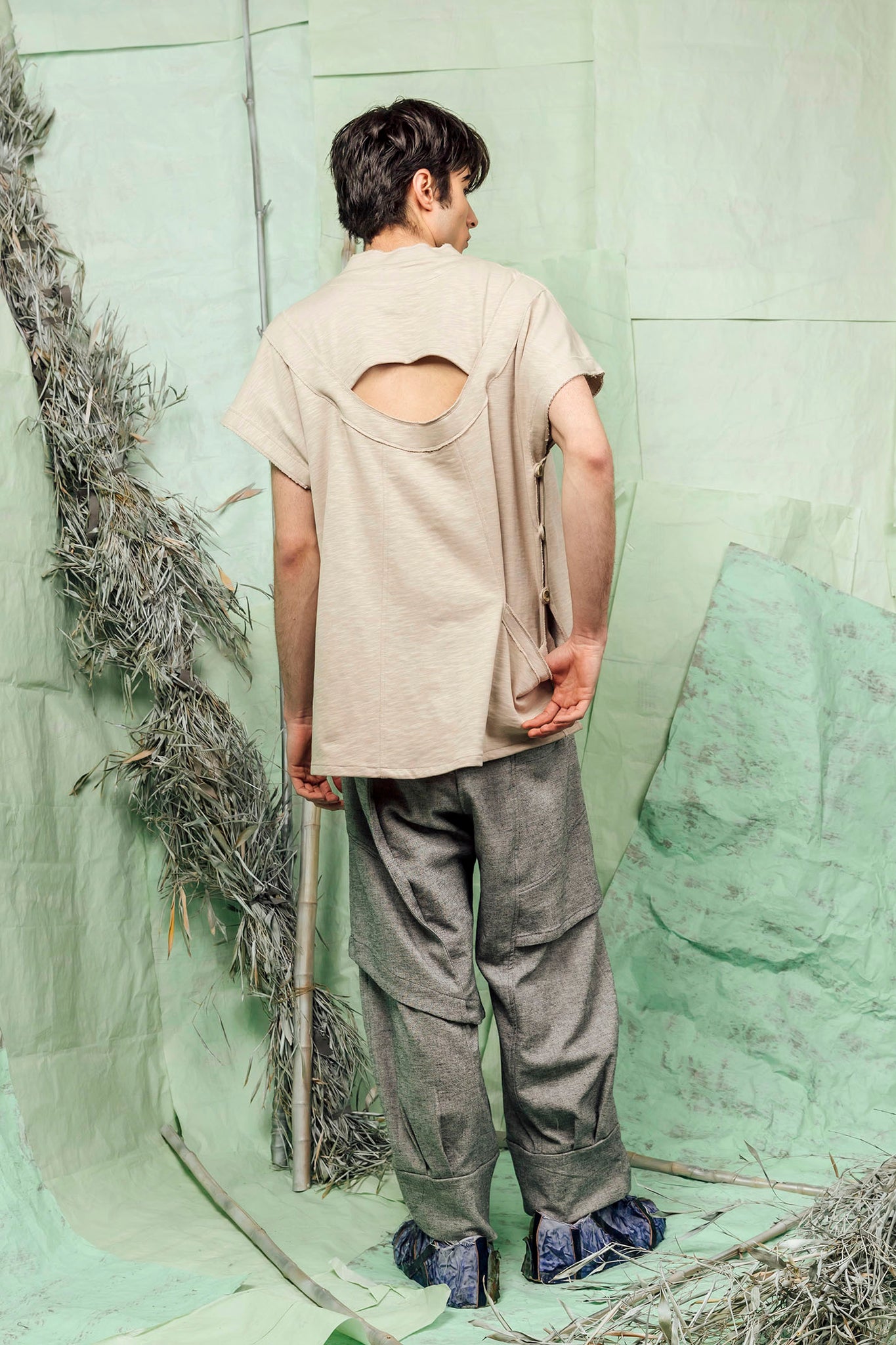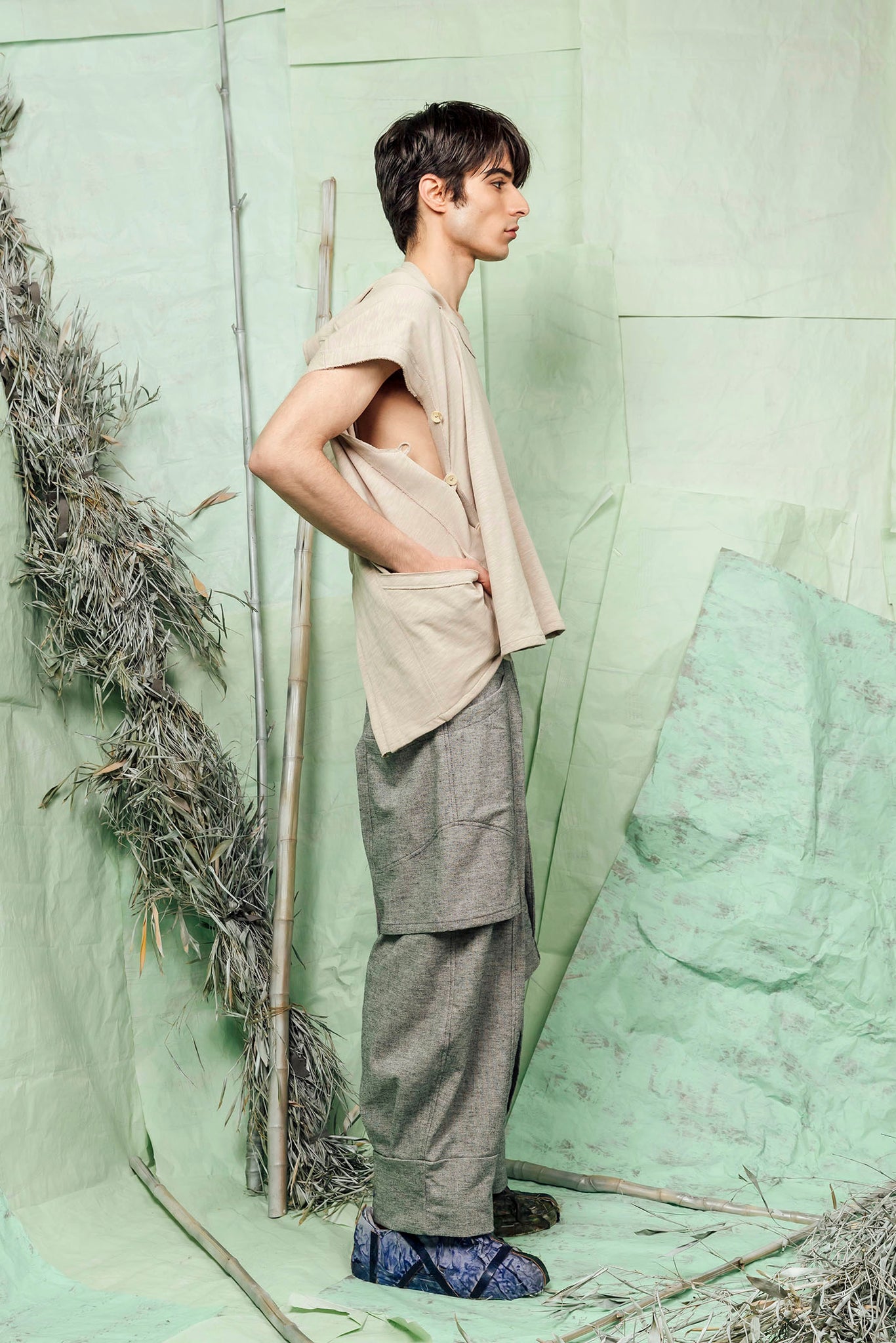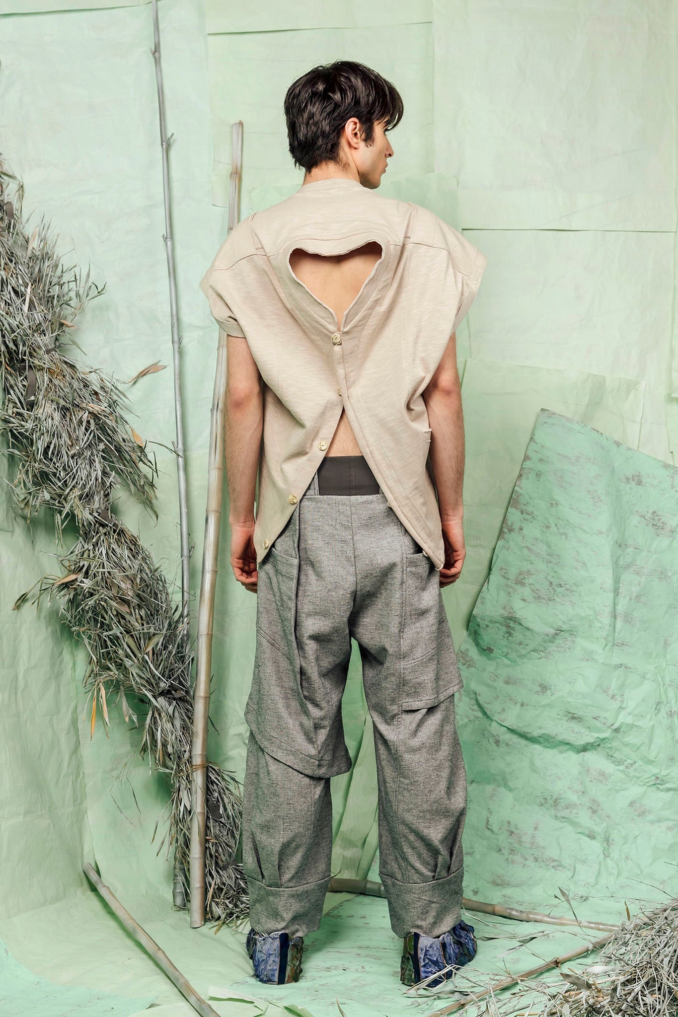 - Flipping back to front, the back opening can be worn as a neckline, with the front buttons closed to create a sculptural tunic shape.