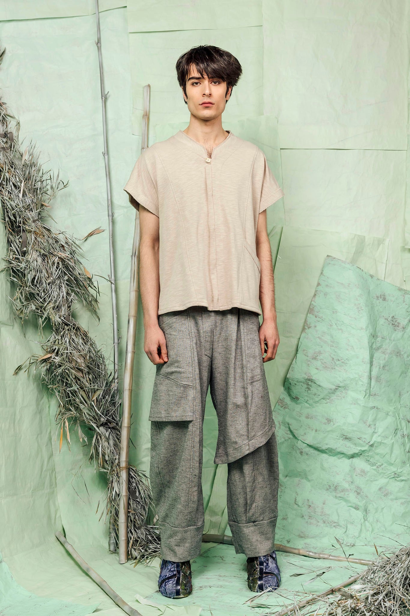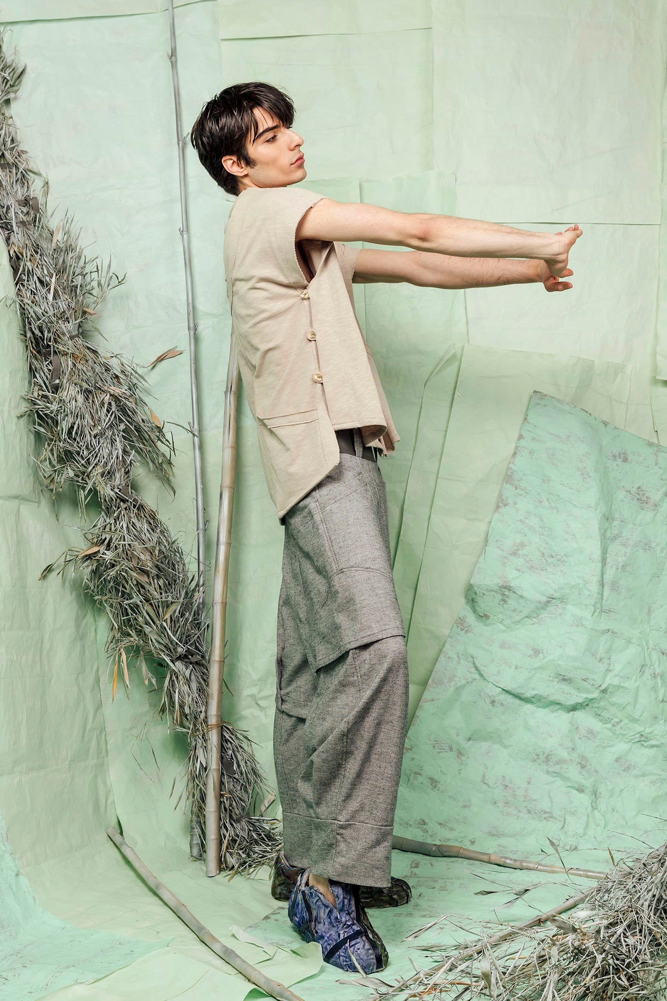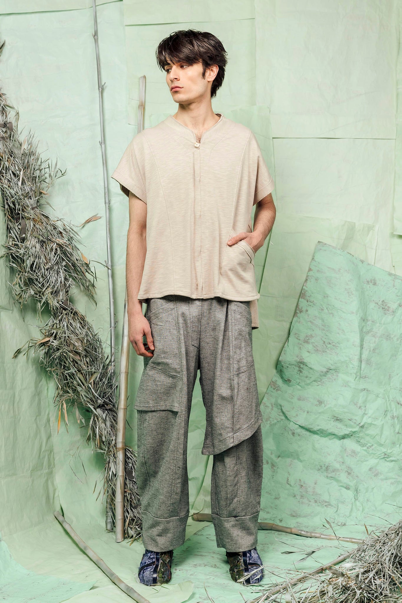 - Flipping back to front, the back opening can be worn as a neckline, with the front buttons closed to create a sculptural tunic shape.